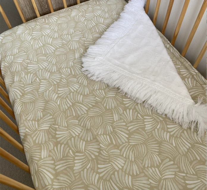 Our watercolour painted jersey cotton cot sheet in this gorgeous sandy shell design.