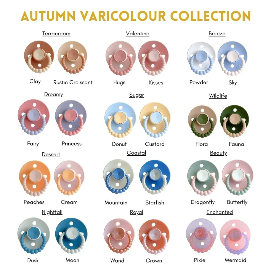 CMC Gold dummies come with an air filled teat, which means air or water won’t flow in or out of the teat. Our teats are generally a little bit shorter than most teats out there but have a bigger ball on top to better help bub latch onto when soothing.
