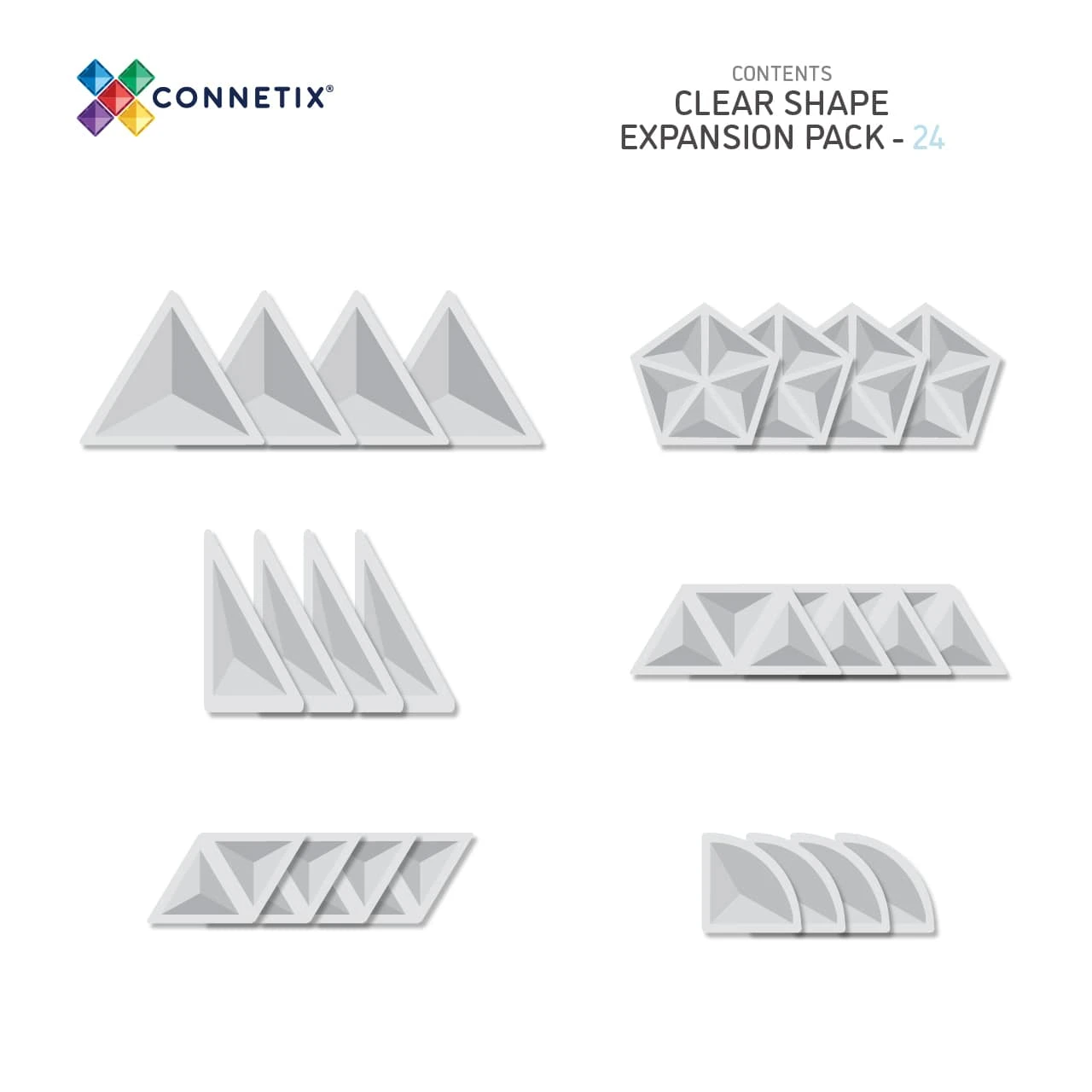 Inspire new ways to play and create with our 24 Piece Clear Shape Expansion Pack! Featuring a variety of magnetic tile shapes including large triangles, right-angle triangles, quarter circles, pentagons, trapezoids, and rhombi, this pack will introduce you to a new world of STEAM learning through play!