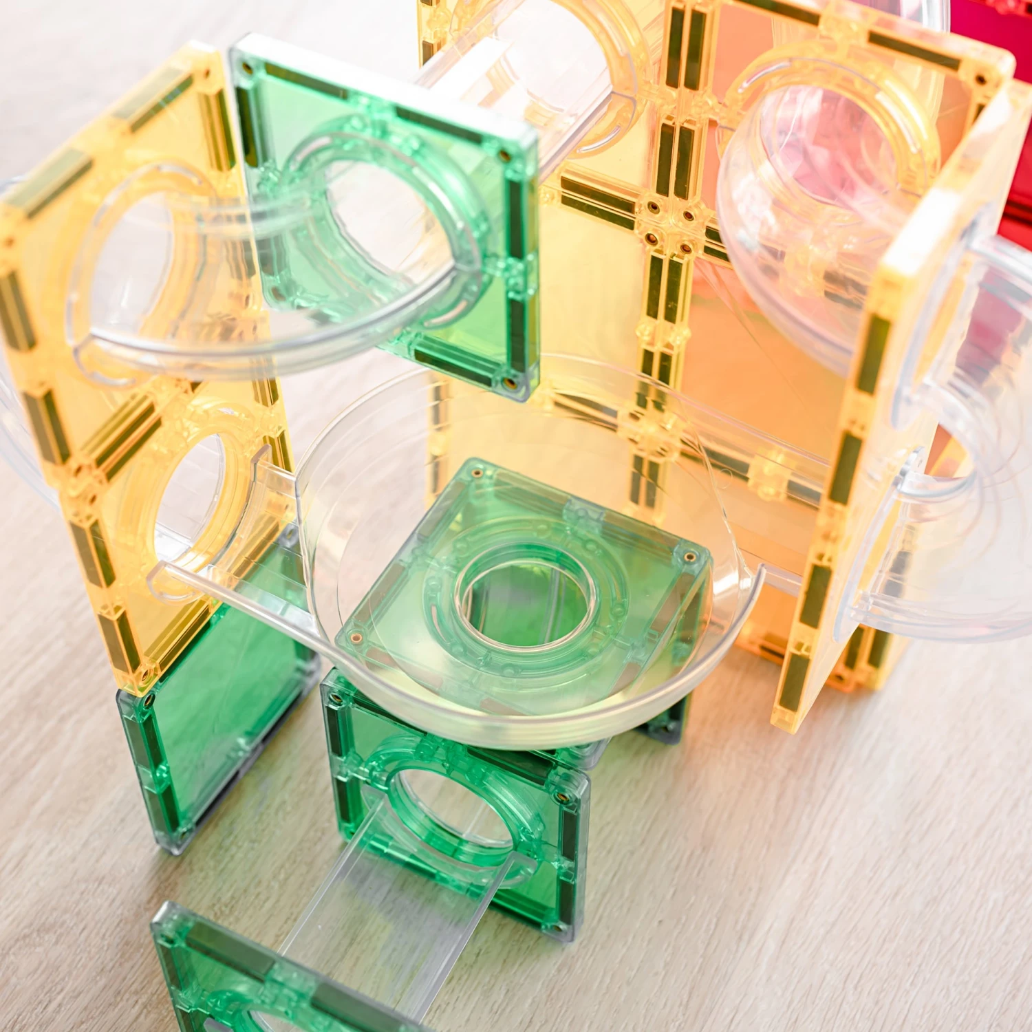 This open-ended expansion pack includes connector square magnetic tiles, wooden balls plus a range of clear, fluted tubes to allow you to explore motion and gravity like never before – an X-shape to re-direct and pivot the action, double-entry bowls for new ways to collaboratively play and race, spiral pieces for eye tracking fun, plus 1/2 and 1/4 pieces for twists and turns.