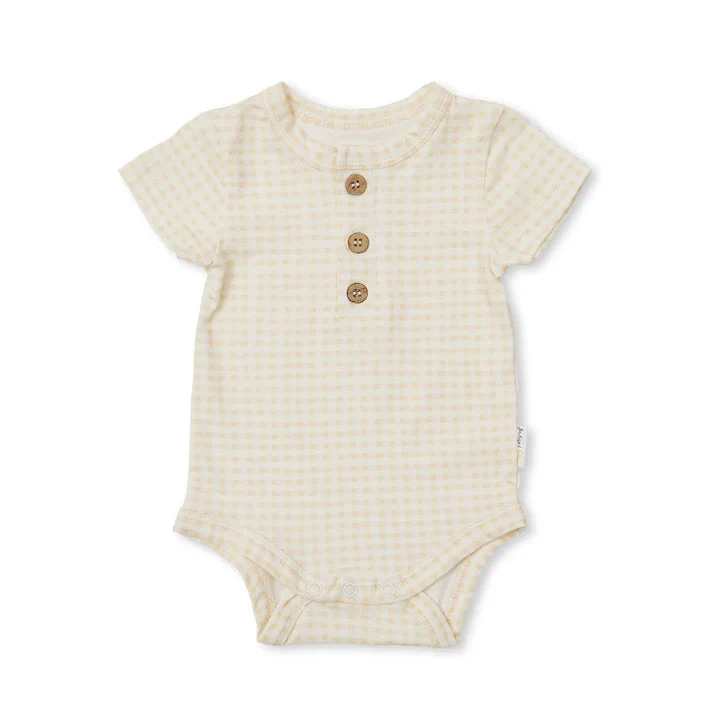 This sweet short sleeved bodysuit is a staple for all babies. It has 2 functional buttons at the neckline and 3 snap buttons on the bottom for easy changes. Perfect for layering under a zipsuit, wearing on its own or paired with shorts for the cutest Australian warm summer day casual ensemble.