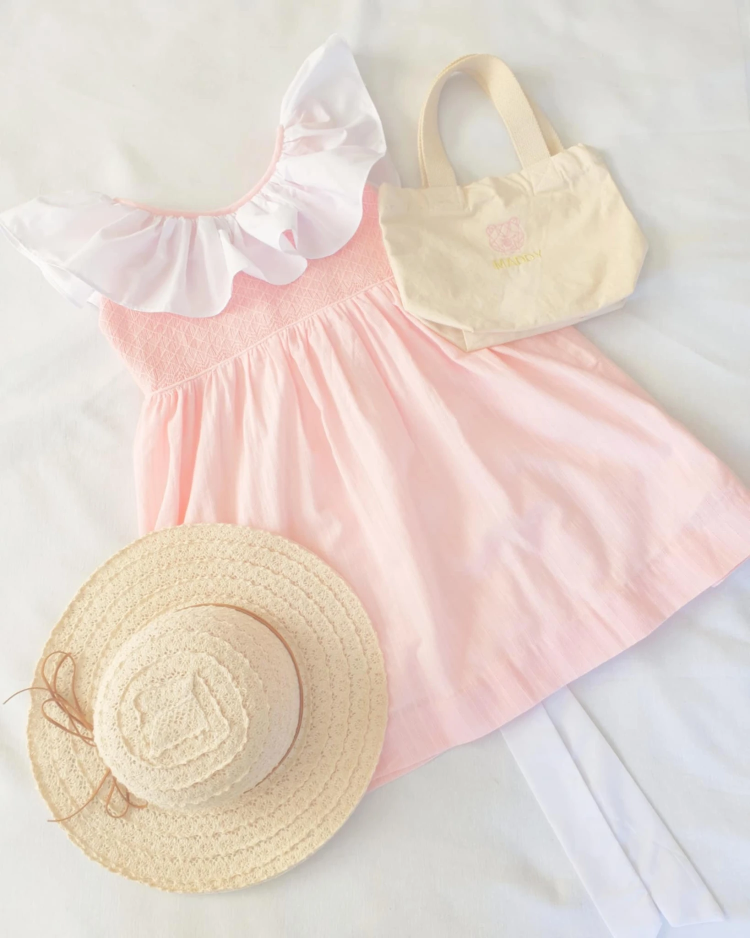 This amazing pink hand smocked dress with white ruffle is a MUST have in your babes wardrobe.