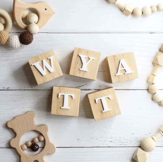 Our beautiful wooden letter blocks are the perfect prop for pregnancy, birth announcement and milestone photos, and are the cutest nursery decoration.