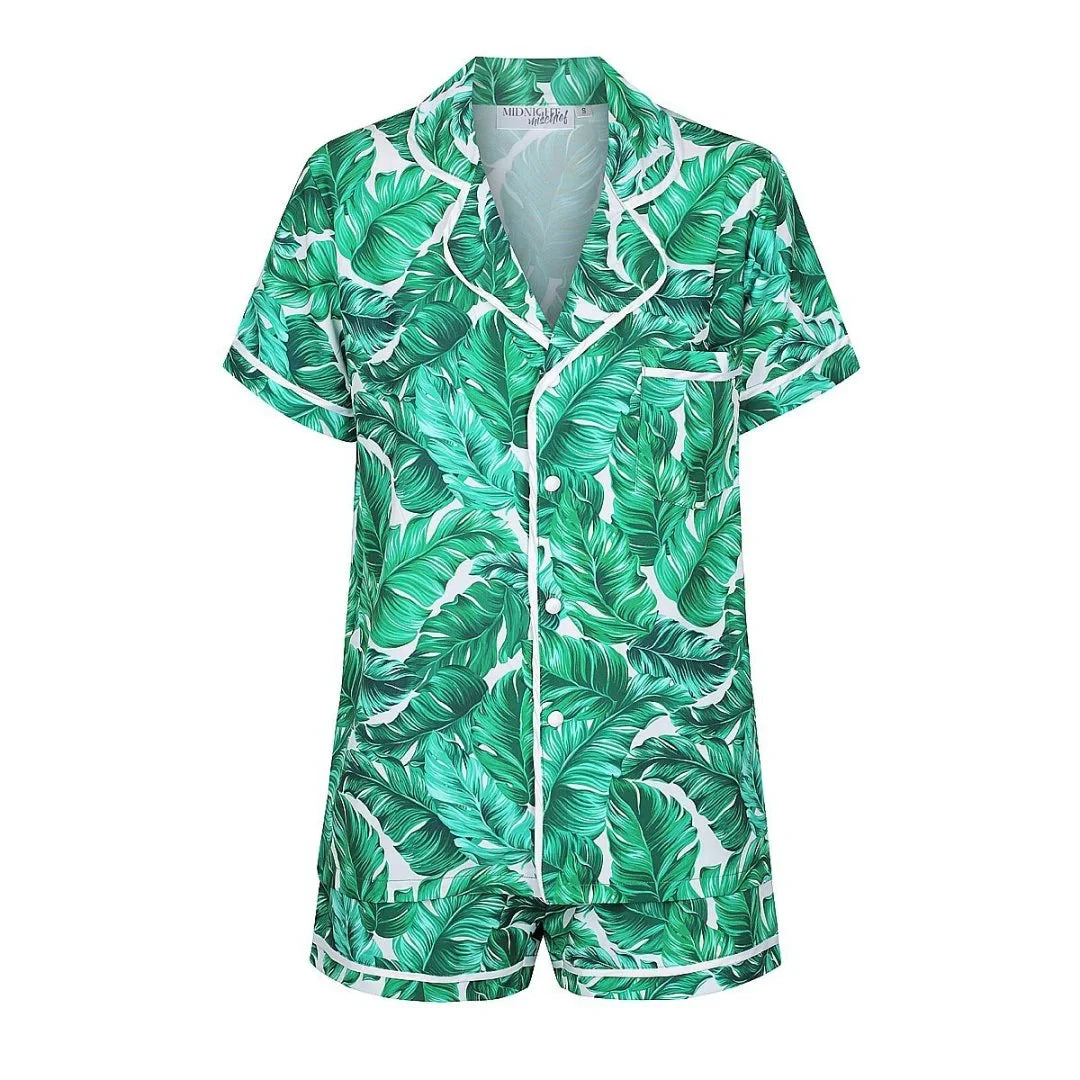 This soft luxe satin fabric set features contrasting piped detailing with a closed pocket, matching buttons, a collared shirt, short sleeves, and ribbon tied shorts with one pocket.