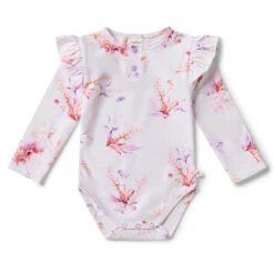 Snuggle Hunny organic bodysuits are made for babies and toddlers and our exclusive Coral print is bold, bright and beautiful. This bodysuit is long-sleeved, and great for cooler days in Summer and Winter under layers.