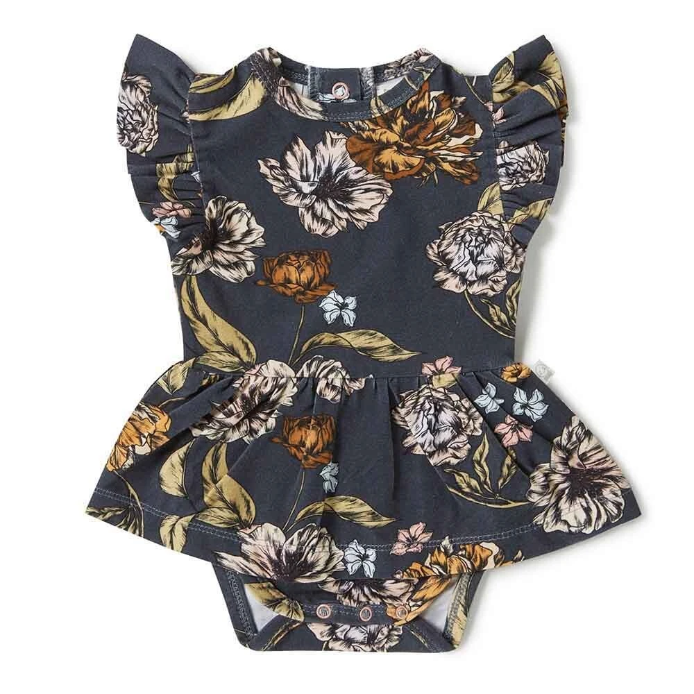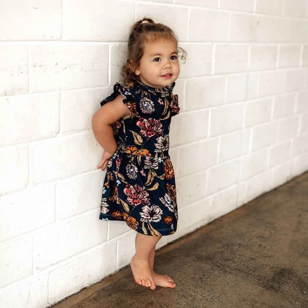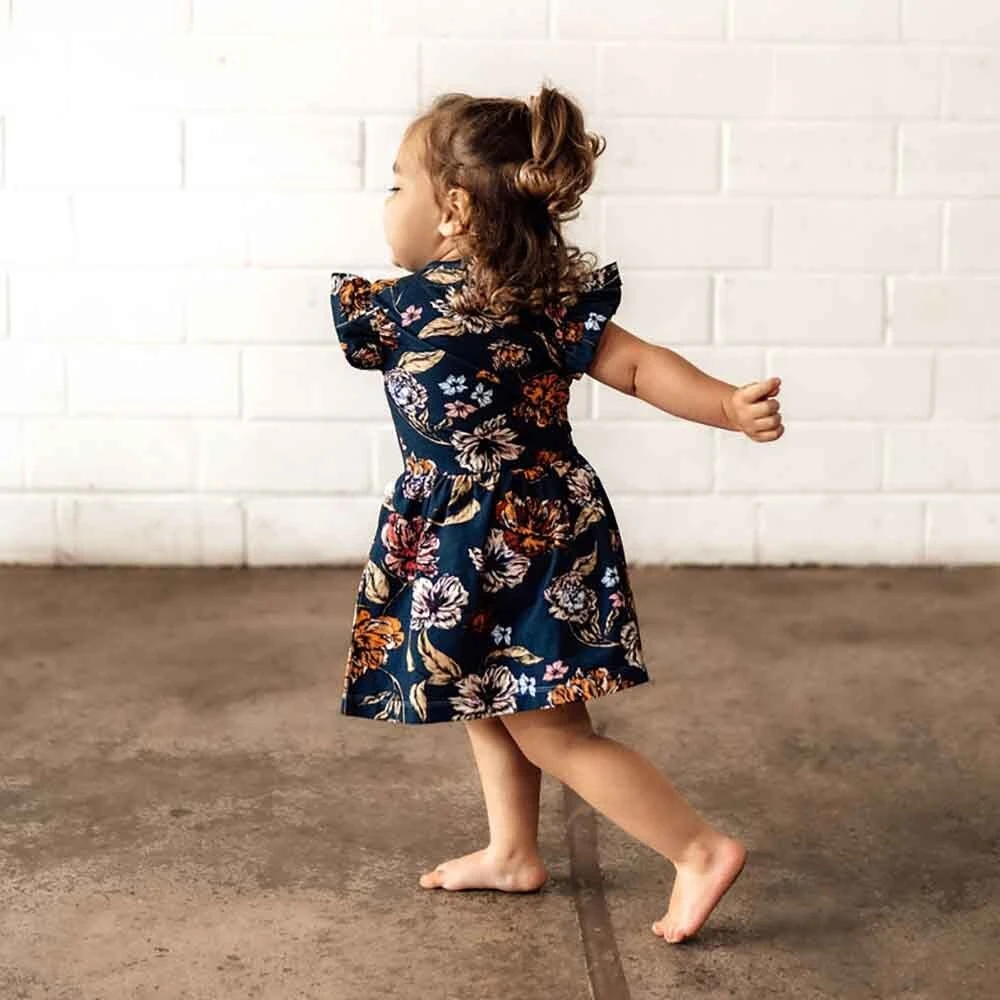 Soft and stretchy, our dresses are easy-care and very comfy for bub. The sizes up to and including size 1 come with a snap underbody to go over a nappy. Size 2 doesn’t have the snap body feature. We have really focused on the details and ensured the dresses up to size 1 are short enough so that a baby can crawl and not trip over the skirt. Size 2, when they’re walking, is a bit longer.