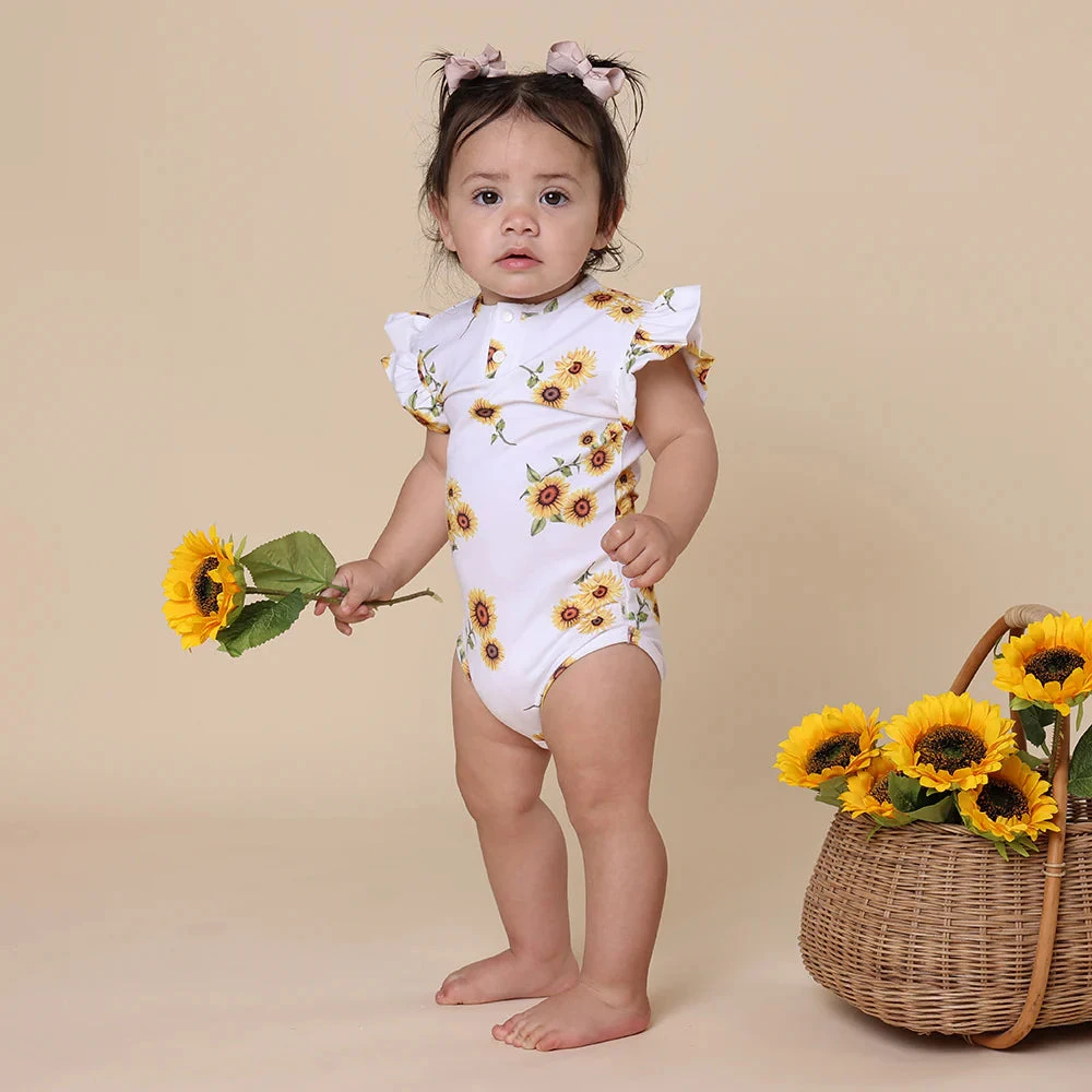Soft and stretchy, our bodysuits are easy-care and coordinate well with our bloomers, pants and shorts. The bloomers have sweet frills to match the sleeves on this style.