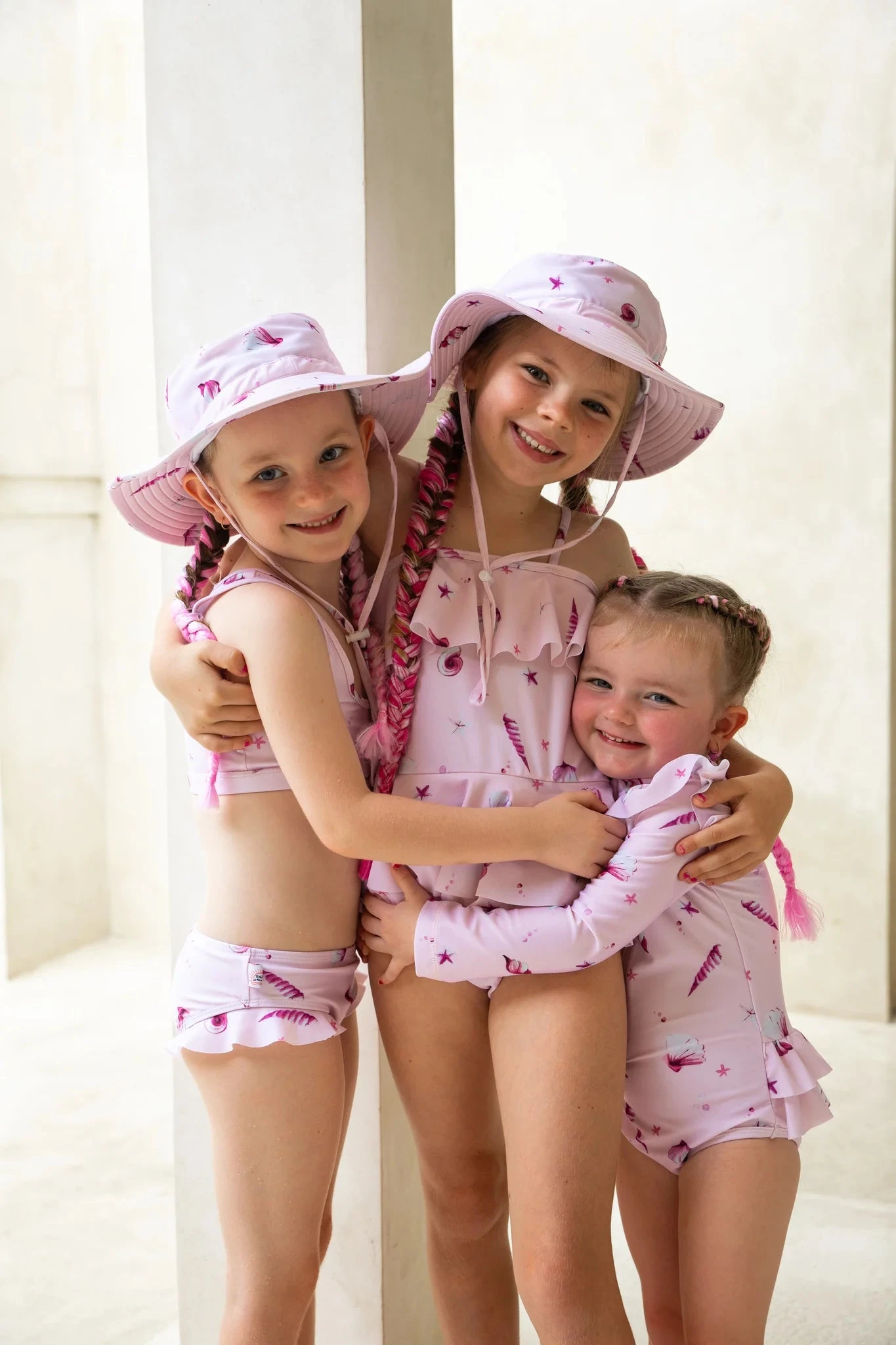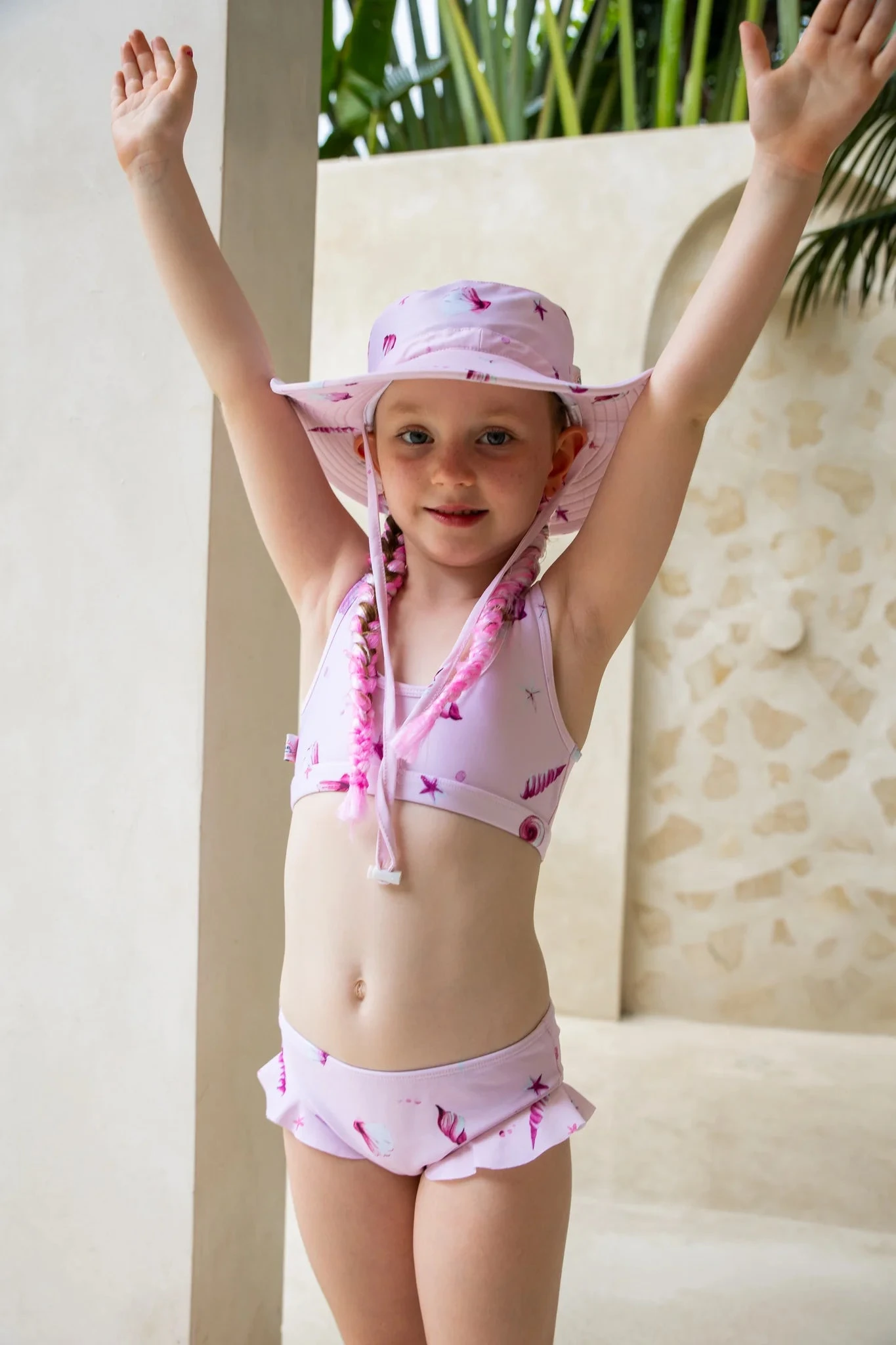 Our girls bikini comes in just our custom Boho print. With beautiful frills and a tie up back, this truly is the perfect addition. Our Eco Friendly swimsuits for toddlers and babies are designed in Australia for fun in the sun. This girls bikini looks trendy and styled with our seashells swim hat for the perfect combination this summer.