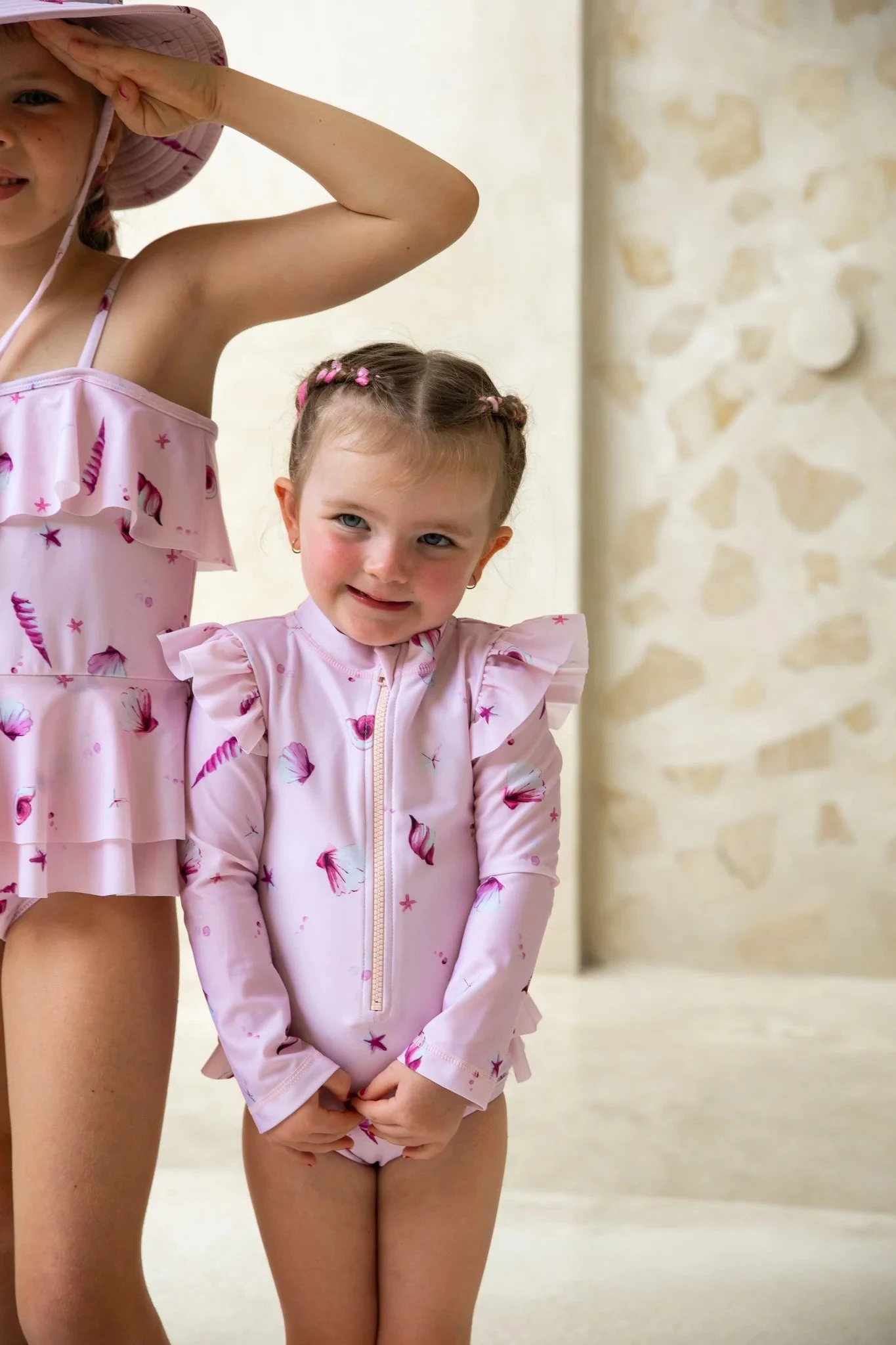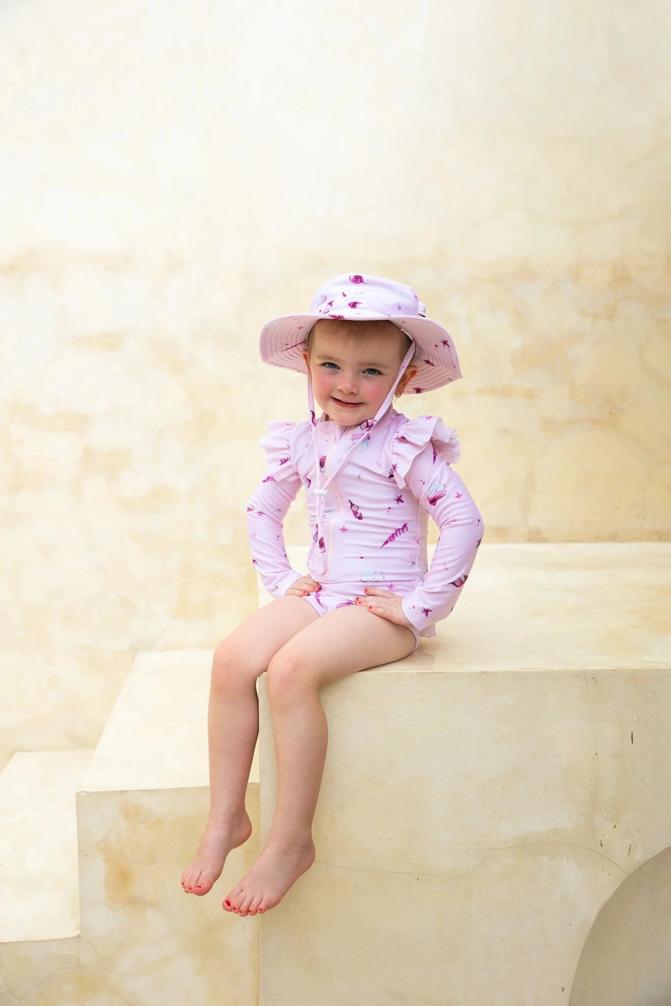 Our Eco Friendly swimsuits for toddlers and babies have long sleeves for full-upper body sun protection, your little adventurers can swim and play all summer long with UPF50+ fabrics. Designed in Australia for fun in the sun this looks trendy and styled with our Seaside collections swim hat. This one-piece zip front has long sleeves, high neck, and brief bottoms with beautiful frill detail at the back. This is the best UV swimwear for toddlers.