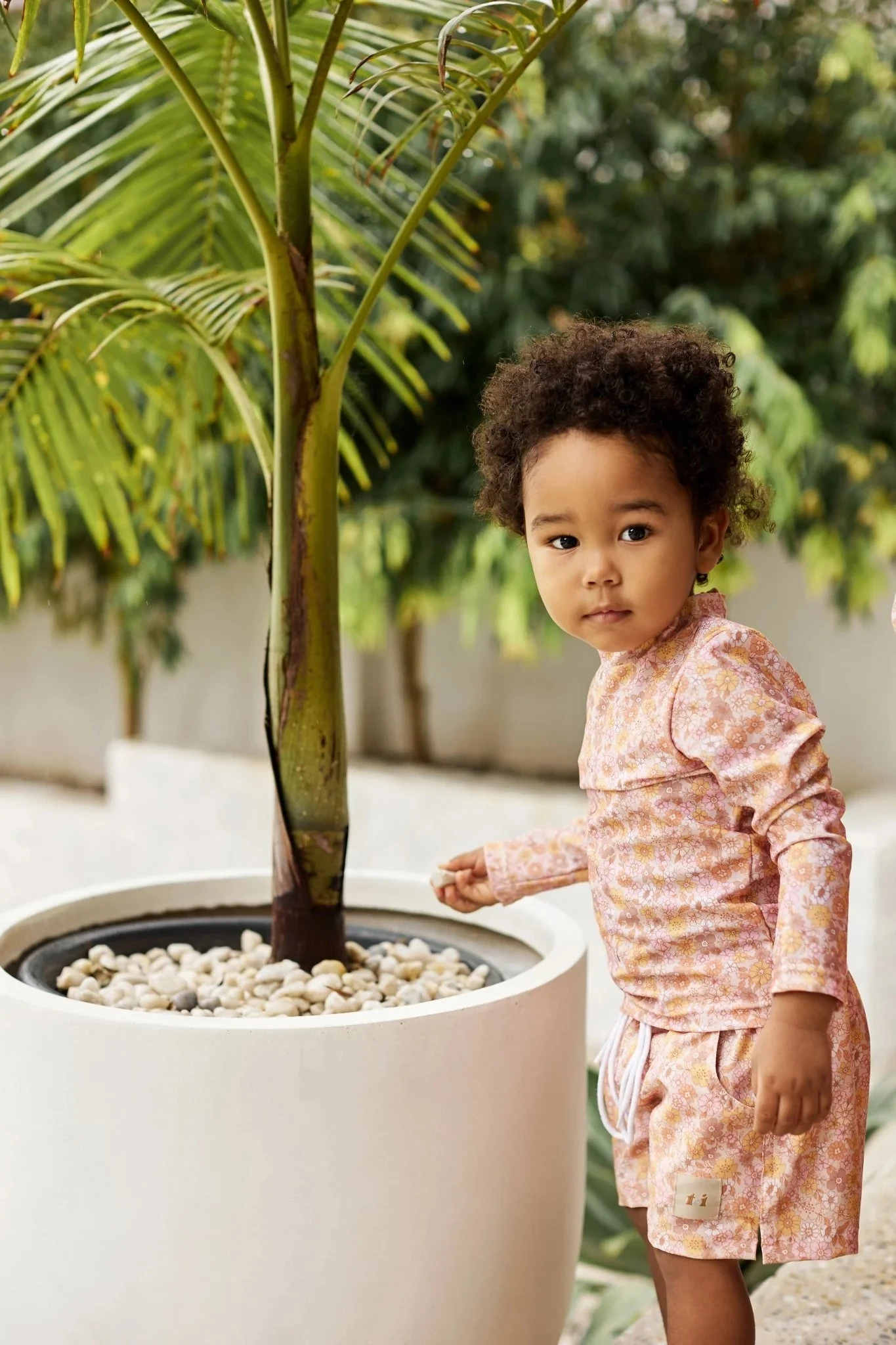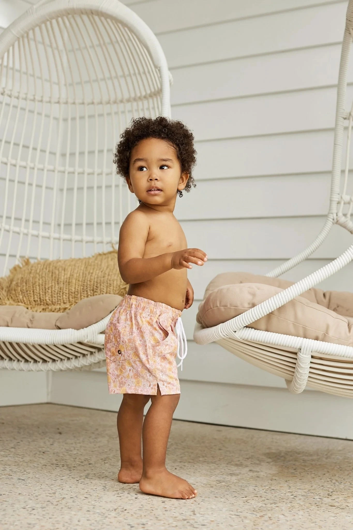 Boho flowers with pink and orange tones or deep rust with happy sun faces… the perfect summer combo for all the sunshine fee. All of our high summer collections coordinate beautifully, for a matchy-matchy look across ages. These are the best swim shorts in Australia.