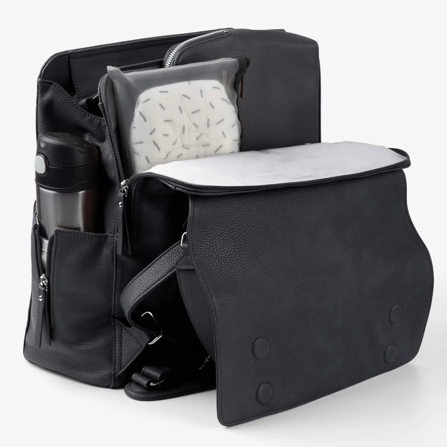 - Comes with coordinated change mat featuring vegan leather closure
