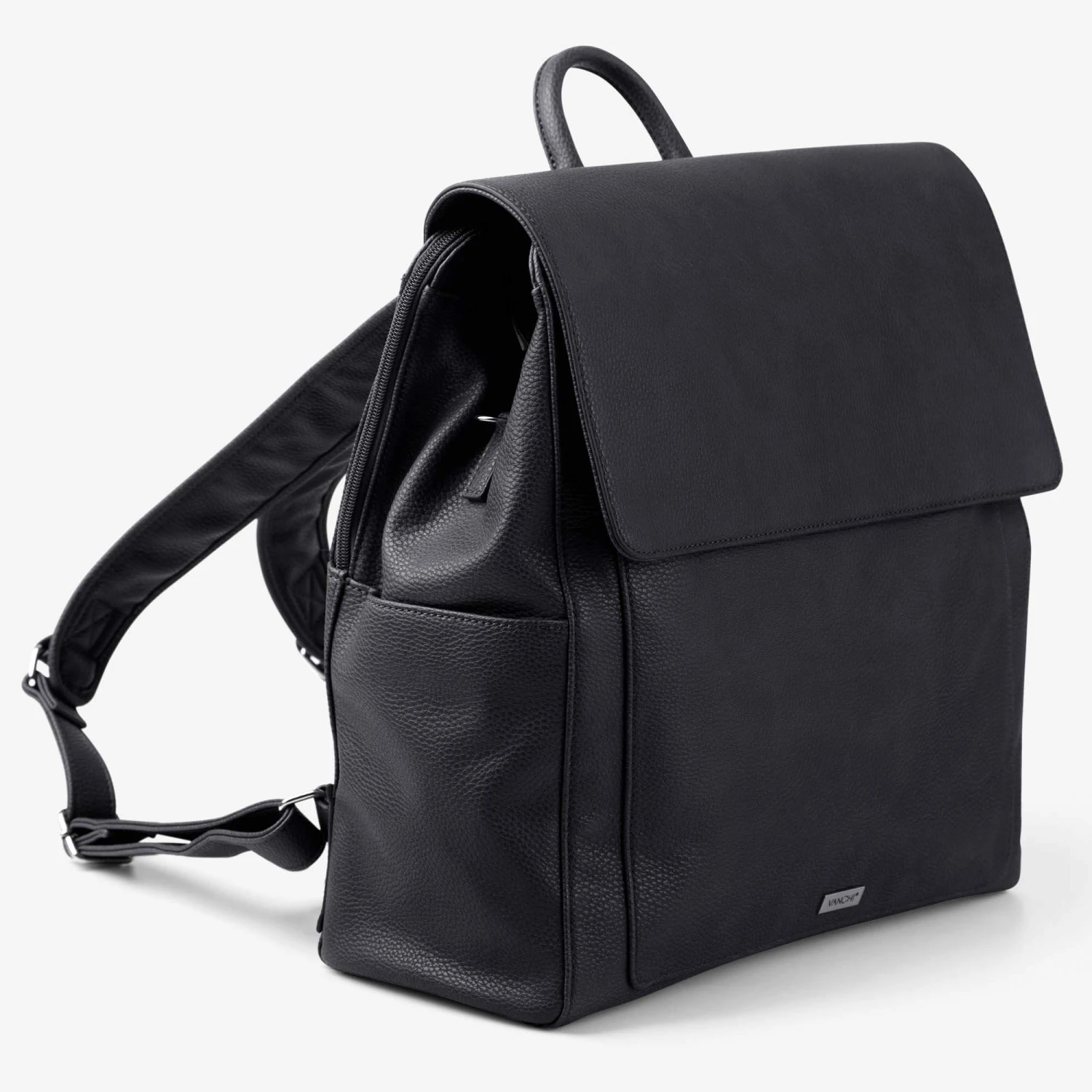 Featuring a sleek minimal design that looks more like a designer backpack than a baby bag, you can make Emmy your own by adding a personalised luggage tag, VANCHI tassel, or dummy keep safe to the perfectly positioned d-ring. The front flap features two hidden magnet positions, so even when Emmy is full the flap still comfortably covers the main compartments and she still looks good.