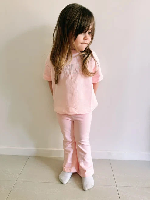 Our Essential flares are true to size. We recommend getting your true size or sizing up if your little one is in-between, to last longer!